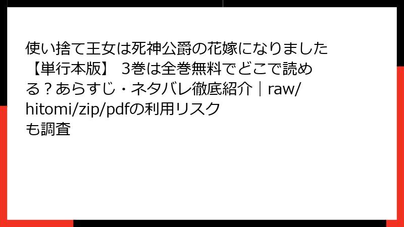 人気のファンタジーロマンス漫画『使い捨て王女は死神公爵の花嫁になりました』を、raw、hitomi、zip、pdf、漫画バンクなどの海賊版サイトで無料で読みたいと思う人もいるかもしれません。しかし、そんな行為には深刻なリスクが伴います。この記事では、法的・セキュリティ面から倫理的側面まで、詳しく掘り下げて解説します。海賊版は一見お得に見えますが、結果として自分や業界に大きな損害を招く可能性が高いんです。読み進めて、賢い選択をしましょう。