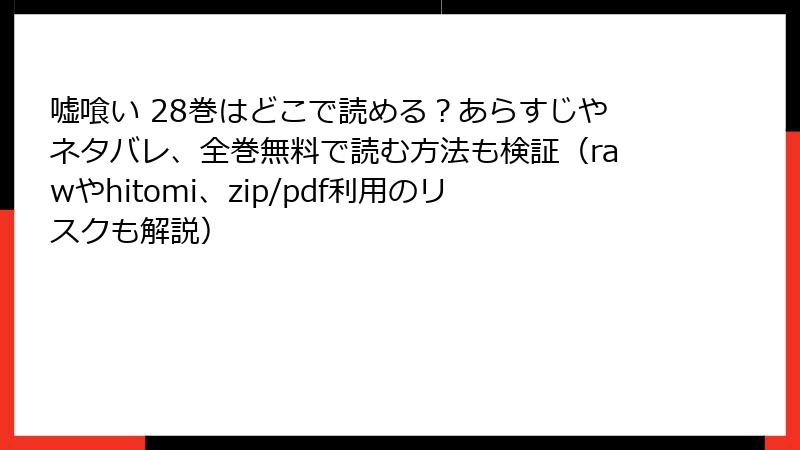 人気漫画『嘘喰い』の28巻を、raw、hitomi、zip、pdf、漫画バンクなどの海賊版サイトで無料で読もうと考える人もいるかもしれません。しかし、これらのサイトを利用することは、さまざまな深刻なリスクを伴います。この記事では、法的側面からセキュリティ、経済的・倫理的な問題までを詳しく解説します。海賊版サイトの魅力に惑わされず、正規ルートで楽しむことを強くおすすめします。以下で、各リスクを深掘りしていきましょう。