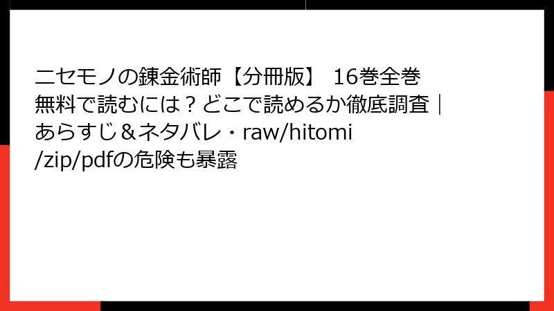 人気の異世界ファンタジー漫画『ニセモノの錬金術師』を無料で楽しみたいという誘惑は強いですが、海賊版サイトを利用するのはおすすめできません。raw、hitomi、zip、pdf、漫画バンクなどの違法アップロードサイトは、気軽にアクセスできるように見えますが、深刻なリスクを伴います。この記事では、そんな海賊版サイトの利用がもたらす法的、セキュリティ、プライバシー、品質、倫理的な問題を詳しく解説します。無料の裏側に潜む危険を理解し、正しい選択をしましょう。