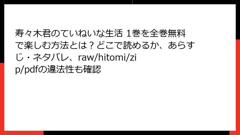 人気漫画「寿々木君のていねいな生活」をraw、hitomi、zip、pdf、漫画バンクなどの海賊版サイトで読むのは、手軽に思えるかもしれません。しかし、これらのサイトは著作権を無視した違法アップロードが主流で、利用者自身に多大なリスクを伴います。法的問題からセキュリティ脅威、倫理的ジレンマまで、さまざまな側面から詳しく解説します。こうした行為は、クリエイターの権利を侵害し、業界全体を弱体化させる可能性が高いのです。