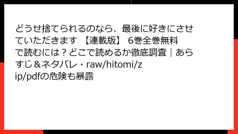 人気のファンタジーロマンス漫画『どうせ捨てられるのなら、最後に好きにさせていただきます』の連載版6巻は、多くの電子書籍サービスで配信されています。この記事では、コミックシーモア、ブックライブ (BookLive)、まんが王国、ebookjapan、Renta!、めちゃコミック (めちゃコミ)、ピッコマ、LINEマンガなどの主要プラットフォームを中心に、どこで読めるかを詳しく解説します。各サービスの特徴やお得なポイントも併せて紹介しますので、購入や試し読みの参考にしてください。なお、価格やキャンペーンは変動する可能性があるため、最新情報を確認することをおすすめします。