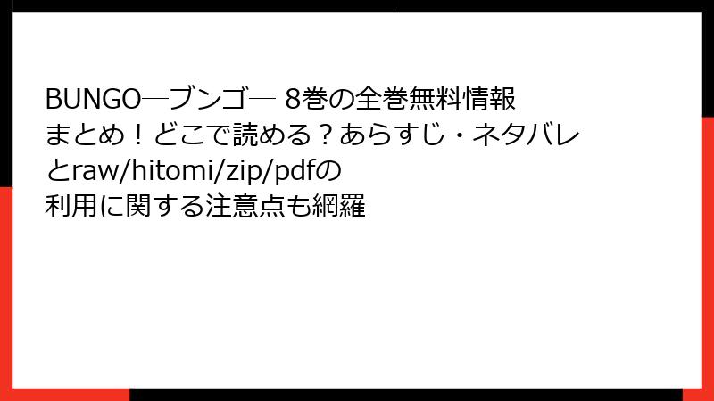 以上のように、raw、hitomi、zip、pdf、漫画バンクなどの海賊版サイトで『BUNGO―ブンゴ―』8巻を読むことは、法的、セキュリティ、経済的、倫理的な多大なリスクを伴います。一時の無料欲しさにこれらを冒すのは賢明ではありません。代わりに、正規の手段を選ぶことで、安全に楽しむことが可能です。海賊版の誘惑に負けず、健全な漫画ライフを送りましょう。