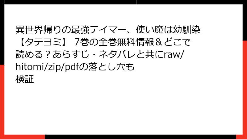 この記事では、ファンタジー要素満載の人気タテヨミコミック「異世界帰りの最強テイマー、使い魔は幼馴染」の7巻について、詳細なあらすじをネタバレ込みで解説します。異世界帰還後の現実世界が一変した設定が魅力の作品で、主人公たちの冒険がさらに加速する巻です。読み応えを出すために、ストーリーの流れを細かく分解して紹介します。