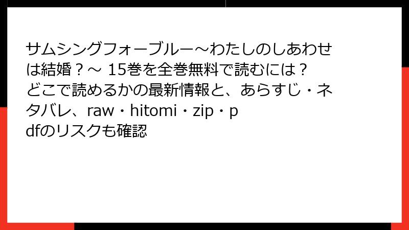 人気漫画「サムシングフォーブルー~わたしのしあわせは結婚?~」を、raw、hitomi、zip、pdf、漫画バンクなどの海賊版サイトで読むことは、一見手軽に思えるかもしれません。しかし、これらのサイトを利用する行為にはさまざまなリスクが伴います。この記事では、そうした海賊版サイトの利用がもたらす潜在的な問題を、法的・セキュリティ・プライバシー・経済的・品質の観点から詳しく解説します。海賊版はクリエイターや業界に悪影響を及ぼすだけでなく、ユーザー自身にも深刻なトラブルを引き起こす可能性があることを理解しましょう。