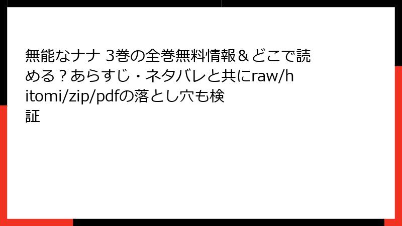 人気漫画『無能なナナ』を無料で楽しみたいという誘惑から、海賊版サイト(raw、hitomi、zip、pdf、漫画バンクなど)を利用する人がいます。しかし、これらのサイトは違法アップロードされたコンテンツを提供しており、利用には深刻なリスクが伴います。この記事では、法的・セキュリティ・経済的・倫理的な観点からリスクを詳しく解説します。海賊版利用は作者や業界に損害を与え、自身にも危険を招く可能性が高いので、強くおすすめしません。正規のプラットフォームで楽しむことを検討してください。