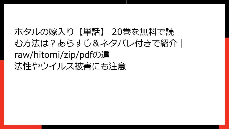 人気漫画『ホタルの嫁入り』の第20巻を、raw/hitomi/zip/pdf/漫画バンクなどの海賊版サイトで読むのは、手軽に思えるかもしれませんが、さまざまなリスクが伴います。この記事では、そうした海賊版サイトを利用する際の潜在的な危険性を詳しく解説します。法的問題からセキュリティの脅威まで、幅広く考察し、なぜ正規の方法で楽しむべきかを考えていきましょう。なお、この情報は一般的な知識に基づき、個別のケースは専門家に相談してください。
