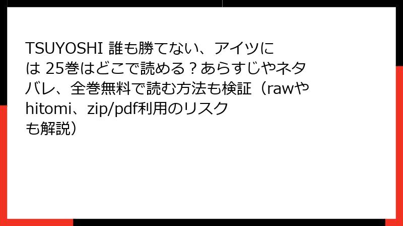 『TSUYOSHI 誰も勝てない、アイツには』をraw/hitomi/zip/pdf/漫画バンクなどで読むリスクは、法的・セキュリティ・プライバシー・品質の面で多岐にわたります。一瞬の便利さが一生の後悔を生む可能性があるため、合法的な手段を選ぶことをおすすめします。海賊版の利用は避け、正しい方法で作品を楽しむことが、ファンとしての責任です。