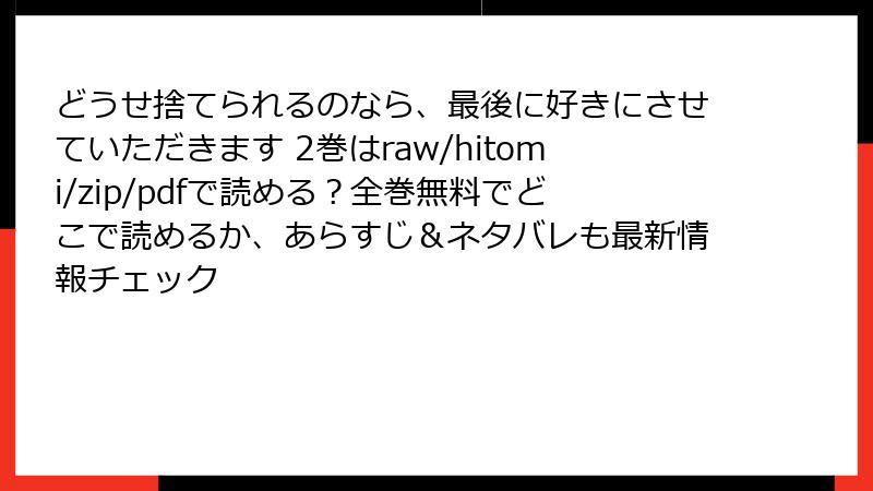 raw、hitomi、zip、pdf、漫画バンクなどの海賊版サイトで『どうせ捨てられるのなら、最後に好きにさせていただきます』を読むことは、法的・セキュリティ・経済的・倫理的な多大なリスクを伴います。これらの危険を避けるためには、正規の配信サービスを利用することが最善です。短期的な無料の魅力に惑わされず、安全で質の高い読書体験を選びましょう。最終的に、海賊版は自分自身を害する行為であることを認識することが重要です。