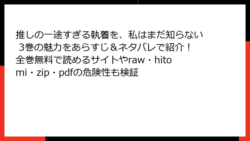 海賊版サイトで「推しの一途すぎる執着を、私はまだ知らない」を読むのは、法的・セキュリティ・品質面で多大なリスクを伴います。これらを避けるため、公式プラットフォームでの利用を検討するのが賢明です。リスクを理解し、自己責任で行動することが重要ですが、長期的に見て公式ルートが安心で満足度の高い選択肢となります。