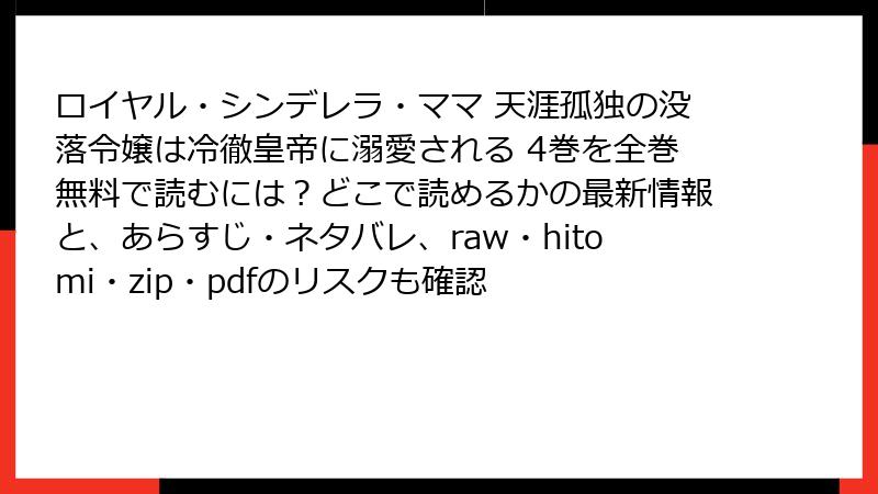 この記事では、人気漫画「ロイヤル・シンデレラ・ママ 天涯孤独の没落令嬢は冷徹皇帝に溺愛される」を、raw、hitomi、zip、pdf、漫画バンクなどの海賊版サイトで読むことのリスクについて、詳細に解説します。これらのサイトは一見無料で便利に見えますが、さまざまな危険が潜んでいます。ブログ形式で、法的・セキュリティ面を中心に深掘りしていきます。海賊版の利用は避け、正規の方法をおすすめします。