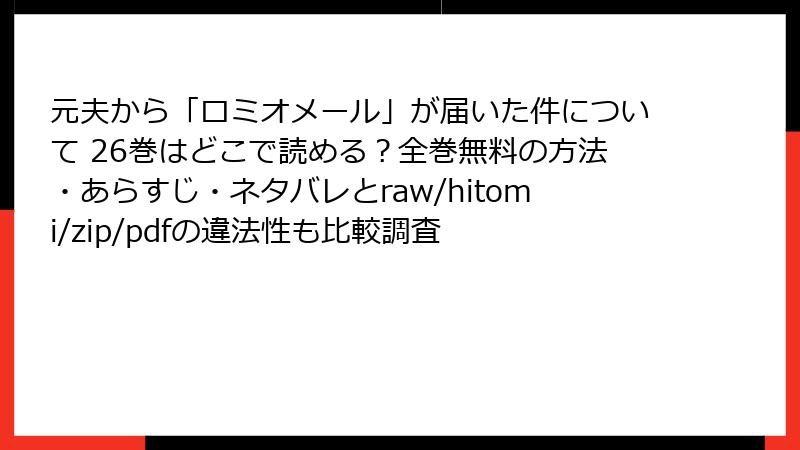 人気漫画「元夫から「ロミオメール」が届いた件について」を、raw、hitomi、zip、pdf、漫画バンクなどの海賊版サイトで読む行為は、著作権侵害に関連する深刻な問題を引き起こします。これらのサイトは、無許可で漫画をアップロード・配信しており、利用者は一見無料で楽しめると錯覚しますが、実際には多大なリスクを伴います。以下では、法的、セキュリティ、プライバシー、品質、倫理的な観点から詳しく解説します。これらのリスクを知ることで、正規のプラットフォームを利用する重要性が理解できるでしょう。