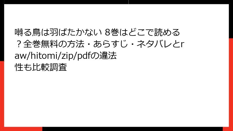 ヨネダコウの人気BL漫画『囀る鳥は羽ばたかない』の8巻は、2023年3月に発売され、多くの電子書籍サービスで配信されています。ここでは、指定されたサービス(コミックシーモア、ブックライブ、まんが王国、ebookjapan、Renta!、めちゃコミック、ピッコマ、LINEマンガ)について詳しく解説します。各サービスで購入やレンタルが可能で、無料試し読みも提供されている場合が多いです。配信状況は変動する可能性があるので、最新情報を確認することをおすすめします。