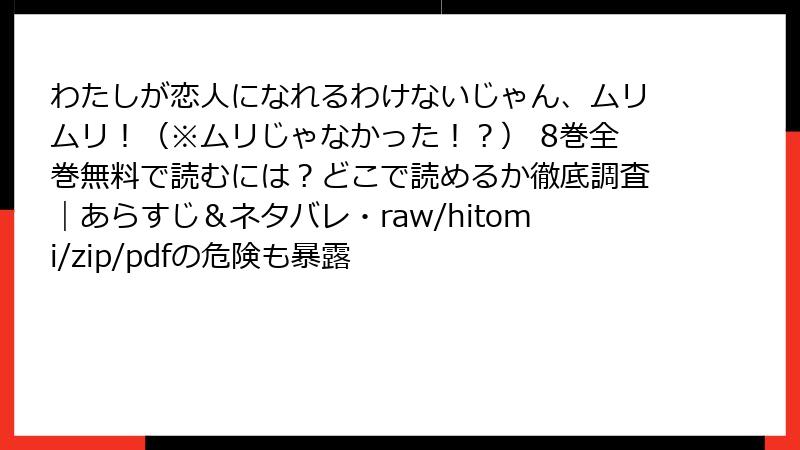 人気の漫画「わたしが恋人になれるわけないじゃん、ムリムリ!(※ムリじゃなかった!?)」を楽しむ方法として、raw/hitomi/zip/pdf/漫画バンクなどの海賊版サイトを利用する人がいるかもしれません。しかし、これらのサイトは違法アップロードされたコンテンツを提供しており、利用には深刻なリスクが伴います。この記事では、法的、セキュリティ、経済的、品質、倫理的な観点から詳しく解説します。海賊版の利用は避け、正規のプラットフォームで作品をサポートすることをおすすめします。