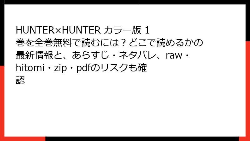 HUNTER×HUNTER カラー版 1巻のような人気漫画を、raw、hitomi、zip、pdf、漫画バンクなどの海賊版サイトで読むのは一見便利に見えますが、深刻なリスクが伴います。これらのサイトは著作権を侵害した違法コンテンツを提供しており、利用者は知らず知らずのうちにトラブルに巻き込まれる可能性が高いです。以下では、法律面、セキュリティ面、経済面、その他の観点からリスクを詳しく解説します。海賊版の利用は避け、正規のプラットフォームで楽しむことを強くおすすめします。