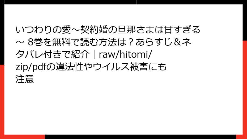 人気の漫画「いつわりの愛~契約婚の旦那さまは甘すぎる~」を、raw、hitomi、zip、pdf、漫画バンクなどの海賊版サイトで読むのは一見手軽に見えますが、深刻なリスクを伴います。これらのサイトは著作権を無視した違法アップロードが主で、利用者は知らず知らずのうちにトラブルに巻き込まれる可能性が高いです。以下で、法的、セキュリティ、プライバシー、品質・倫理的な観点から詳しく解説します。利用を検討している方は、ぜひこれらの危険性を理解してください。
