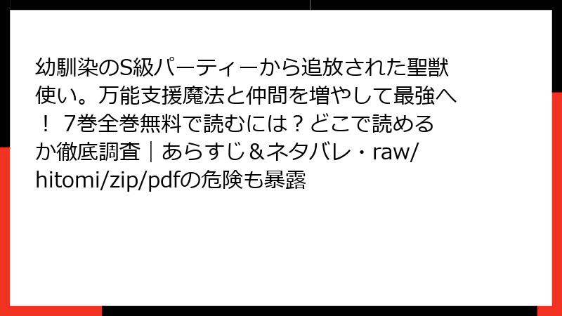 人気のファンタジー漫画「幼馴染のS級パーティーから追放された聖獣使い。万能支援魔法と仲間を増やして最強へ!」を楽しむために、海賊版サイトを利用する人もいるかもしれません。しかし、raw、hitomi、zip、pdf、漫画バンクなどの違法サイトで読むことは、さまざまな深刻なリスクを伴います。この記事では、それらのリスクを詳しく解説し、なぜ避けるべきかを考察します。法的問題からセキュリティの脅威まで、幅広く取り上げますので、参考にしてください。
