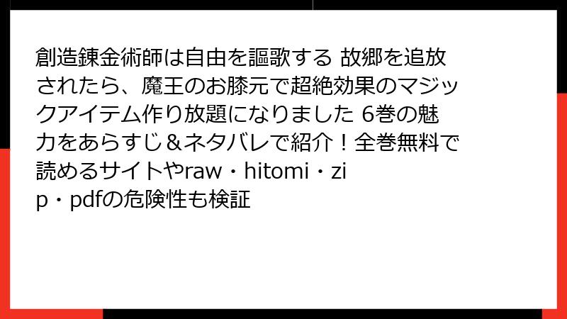 の見出しタグから始めて、ブログ記事形式で出力して。複数の タグを使用して、読み応えがあるように。HTMLで出力。 や などの箇条書きのHTMLタグや、tableタグも使用してOK。ただし、リンクやURLは、絶対に、挿入しない。 この漫画・コミックを、raw/hitomi/zip/pdf/漫画バンクなどの海賊版サイトで読むことのリスクを、詳しく。単一の の見出しタグから始めて、ブログ記事形式で出力して。複数の タグを使用して、読み応えがあるように。HTMLで出力。 や などの箇条書きのHTMLタグや、tableタグも使用してOK。ただし、リンクやURLは、絶対に、挿入しない。 この漫画・コミックの、レビュー・口コミ・評判について、詳しく。単一の の見出しタグから始めて、ブログ記事形式で出力して。複数の タグを使用して、読み応えがあるように。HTMLで出力。 や などの箇条書きのHTMLタグや、tableタグも使用してOK。ただし、リンクやURLは、絶対に、挿入しない。 創造錬金術師は自由を謳歌する 故郷を追放されたら、魔王のお膝元で超絶効果のマジックアイテム作り放題になりました レビュー・口コミ・評判