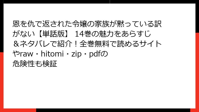 人気コミック『恩を仇で返された令嬢の家族が黙っている訳がない』を、raw、hitomi、zip、pdf、漫画バンクなどの海賊版サイトで無料で読もうと考える人もいるかもしれません。しかし、これらのサイトを利用することは多大なリスクを伴います。この記事では、法的側面からセキュリティ、経済的影響までを詳しく掘り下げ、なぜ避けるべきかを説明します。海賊版サイトは一見便利ですが、潜在的な危険が潜んでおり、長期的に見て損失が大きいのです。