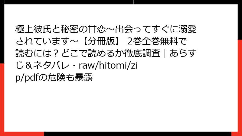 人気のTLマンガ『極上彼氏と秘密の甘恋~出会ってすぐに溺愛されています~【分冊版】 2巻』を、raw、hitomi、zip、pdf、漫画バンクなどの海賊版サイトで読もうと考える人もいるかもしれません。しかし、これらのサイトを利用することは、さまざまな深刻なリスクを伴います。この記事では、そうしたリスクを法的、セキュリティ、経済的・倫理的観点から詳しく解説します。無料で手軽に見える裏側に潜む危険性を理解し、正しい選択をしましょう。
