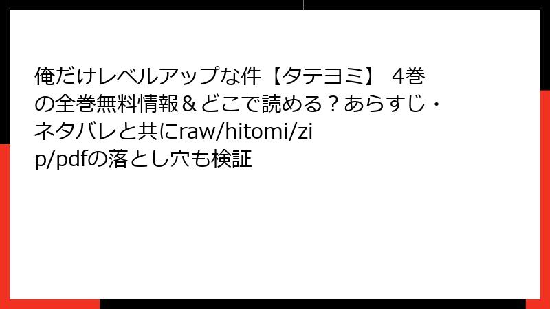 『俺だけレベルアップな件【タテヨミ】』4巻は、全指定サービスで読め、選択肢豊富。ピッコマから始めて、他のサービスで補完するのがおすすめ。タテヨミの爽快さを活かし、主人公の成長を楽しんでください。