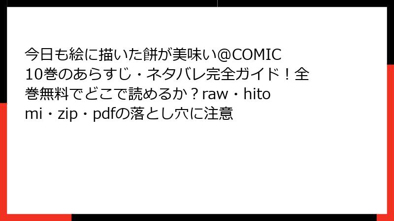 「今日も絵に描いた餅が美味い@COMIC」は魅力的なファンタジー漫画ですが、海賊版サイト(raw、hitomi、zip、pdf、漫画バンクなど)で無料で読もうとすると、さまざまなリスクが伴います。これらのサイトは著作権を侵害したコンテンツを無許可で提供しており、利用者は知らず知らずのうちに問題に巻き込まれる可能性があります。この記事では、そんな海賊版サイトのリスクを法的、セキュリティ、品質、倫理的観点から詳しく解説します。利用を検討している方は、ぜひこれらの点を考慮してください。