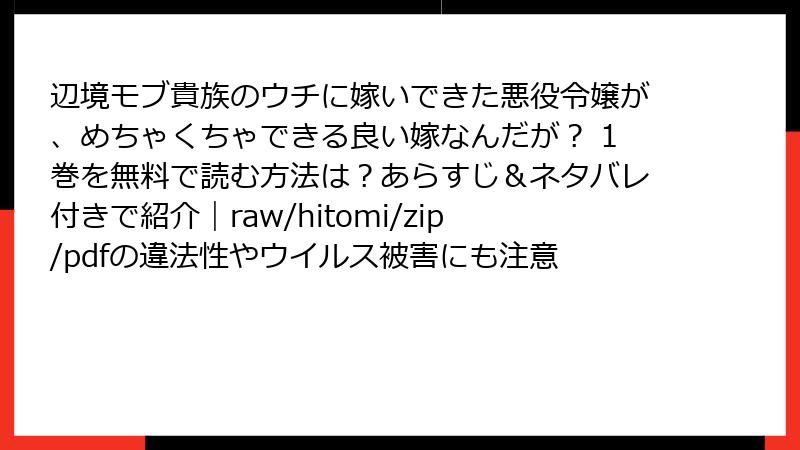 辺境モブ貴族のウチに嫁いできた悪役令嬢が、めちゃくちゃできる良い嫁なんだが? 1巻を無料で読む方法は?あらすじ&ネタバレ付きで紹介|raw/hitomi/zip/pdfの違法性やウイルス被害にも注意