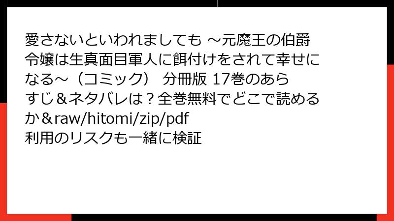 人気コミック『愛さないといわれましても ~元魔王の伯爵令嬢は生真面目軍人に餌付けをされて幸せになる~(コミック) 分冊版 17巻』を、raw、hitomi、zip、pdf、漫画バンクなどの海賊版サイトで無料で読もうとするのは一見魅力的に見えますが、実は多大なリスクを伴います。これらのサイトは著作権を侵害した違法アップロードが横行しており、利用者は知らず知らずのうちに犯罪に加担してしまう可能性があります。以下では、法的・セキュリティ・経済的な観点からリスクを詳しく解説します。安全に楽しむためには、正規の電子書籍サービスを利用することを強くおすすめします。