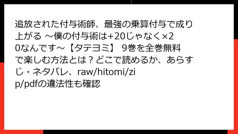 人気のファンタジーマンガ「追放された付与術師、最強の乗算付与で成り上がる ~僕の付与術は+20じゃなく×20なんです~【タテヨミ】 9巻」を、raw、hitomi、zip、pdf、漫画バンクなどの海賊版サイトで読むのは一見便利ですが、さまざまな深刻なリスクが伴います。この記事では、それらのリスクを法的、セキュリティ、倫理的側面から詳しく解説します。海賊版サイトの利用は、短期的な利便性を優先するあまり、長期的な問題を引き起こす可能性が高いのです。以下で、各リスクを深掘りしていきましょう。