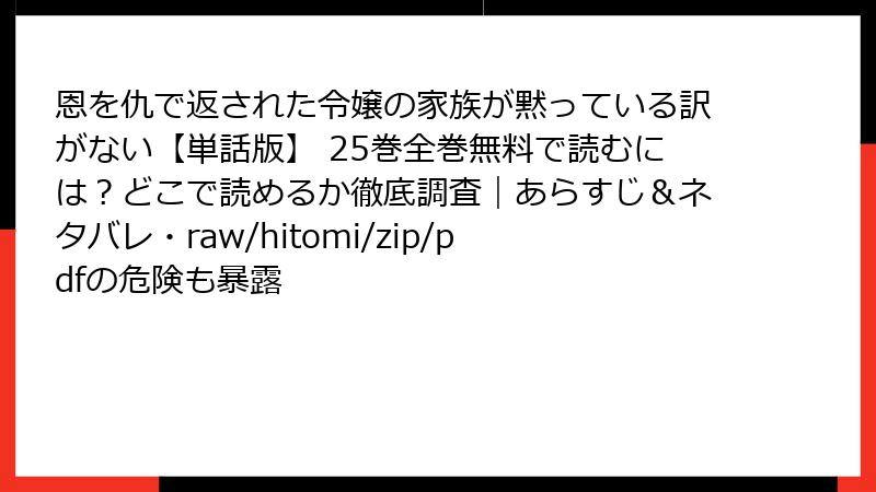 『恩を仇で返された令嬢の家族が黙っている訳がない【単話版】』をrawやhitomiなどで読むのは、法的・セキュリティ・プライバシーなどの多大なリスクを伴います。これらの危険を考えると、正規の手段で楽しむのが最善です。リスクを甘く見ず、安全を優先しましょう。