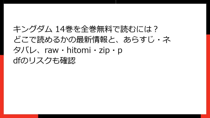 人気漫画『キングダム』の14巻を、raw/hitomi/zip/pdf/漫画バンクなどの海賊版サイトで無料で読もうと考える人は少なくありません。しかし、これらのサイトを利用することは、さまざまな深刻なリスクを伴います。ここでは、法的問題からセキュリティの脅威、倫理的側面までを詳しく解説します。海賊版サイトの利用は一時的な利便性を提供するかもしれませんが、長期的には自分自身や業界全体に悪影響を及ぼす可能性が高いのです。以下で、各リスクを深掘りしていきましょう。