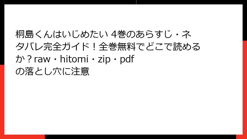 人気BL漫画「桐島くんはいじめたい」の4巻を、raw、hitomi、zip、pdf、漫画バンクなどの海賊版サイトで読むのは一見手軽ですが、実は深刻なリスクが伴います。この記事では、そんな海賊版サイト利用の危険性をブログ形式で詳しく解説。法的問題からセキュリティの脅威まで、複数の側面から掘り下げてお伝えします。海賊版は作者や出版社の権利を侵害する行為ですので、絶対に避けましょう。