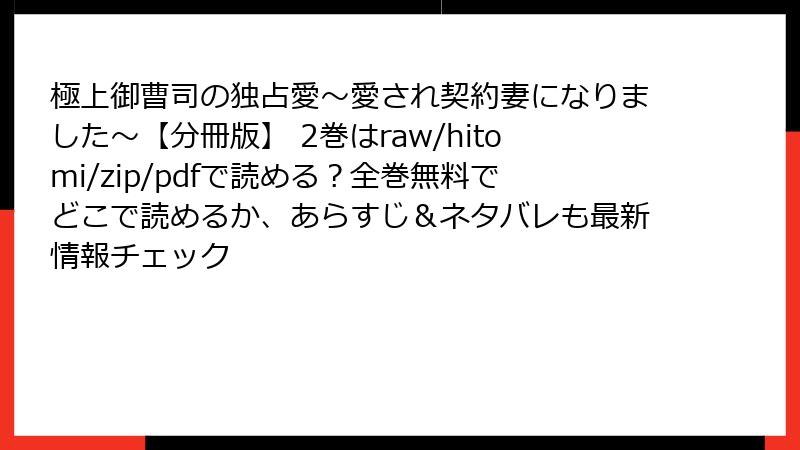 人気のロマンスマンガ「極上御曹司の独占愛~愛され契約妻になりました~【分冊版】 2巻」は、契約結婚をテーマにした甘いストーリーで、多くの電子書籍サービスで配信されています。この記事では、指定されたサービスを中心に、どこで読めるかをブログ形式で詳しく解説します。コミックシーモア、ブックライブ、まんが王国、ebookjapan、Renta!、めちゃコミック、ピッコマ、LINEマンガなどの配信状況を調べ、読み応えのある内容にまとめました。配信情報は2026年1月現在のものですので、最新の状況を確認することをおすすめします。