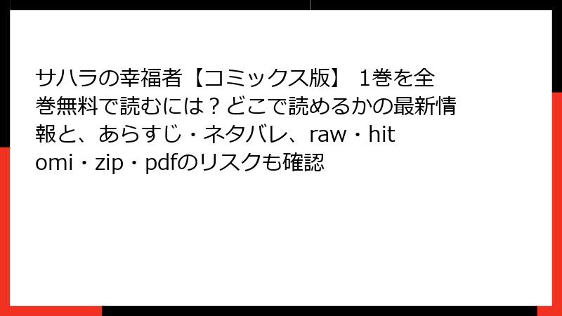 「サハラの幸福者【コミックス版】」をraw/hitomi/zip/pdf/漫画バンクなどで読むのは、短期的には無料に見えても、法的・セキュリティ的な深刻なリスクを伴います。ウイルス感染や個人情報漏洩、業界への悪影響を考えると、決して得策ではありません。正規版で作品を楽しみ、クリエイターを尊重する文化を育てましょう。この記事が、海賊版の危険性を再認識するきっかけになれば幸いです。