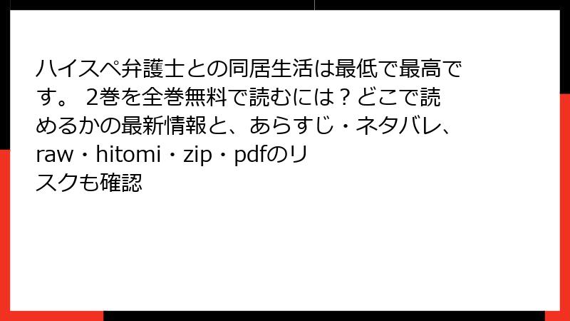 人気ラブコメマンガ『ハイスペ弁護士との同居生活は最低で最高です。』の第2巻を、raw、hitomi、zip、pdf、漫画バンクなどの海賊版サイトで読むことは、一見無料で便利に思えるかもしれません。しかし、これらのサイトを利用する行為は深刻なリスクを伴います。この記事では、法的、セキュリティ、経済的・倫理的、品質面の観点から詳しく解説します。海賊版は作者や出版社の権利を侵害するだけでなく、利用者自身に大きな被害をもたらす可能性が高いため、絶対に避けるべきです。
