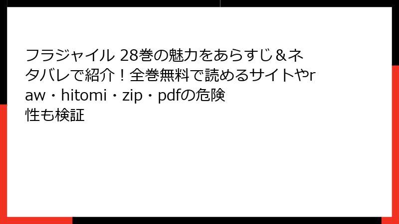 人気医療漫画「フラジャイル 病理医岸京一郎の所見」の28巻を、raw、hitomi、zip、pdf、漫画バンクなどの海賊版サイトで読もうと考える人もいるかもしれません。しかし、これらのサイトを利用することは、さまざまな深刻なリスクを伴います。この記事では、海賊版サイトの利用がもたらす危険性を詳しく解説します。合法的な手段で作品を楽しむことを強くおすすめします。