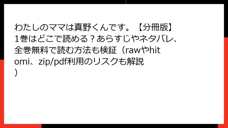 raw、hitomi、zip、pdf、漫画バンクなどの海賊版サイトで「わたしのママは真野くんです。」を読むのは、法的・セキュリティ・プライバシー・倫理的リスクが満載です。これらの危険を避けるため、正規の電子書籍サービスを利用しましょう。安全に楽しむことが、作品と自分を守る最善の選択です。