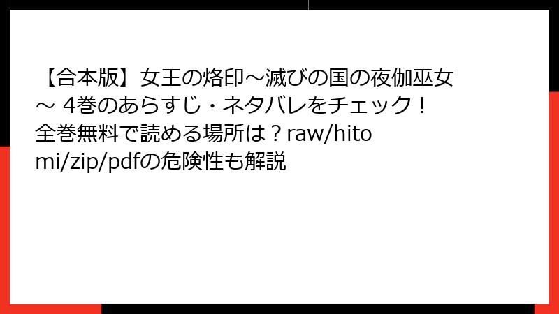 人気のエロティックホラー漫画『女王の烙印~滅びの国の夜伽巫女~』を、raw、hitomi、zip、pdf、漫画バンクなどの海賊版サイトで無料で読もうと考える人は少なくありません。しかし、これらのサイトを利用することは、法的トラブルからセキュリティの脅威まで、さまざまな深刻なリスクを伴います。この記事では、海賊版サイトの利用がもたらす危険性を詳しく解説します。公式ルートを選ぶ重要性を理解し、賢い読書習慣を身につけましょう。ネタバレやあらすじは避け、リスクに焦点を当てます。