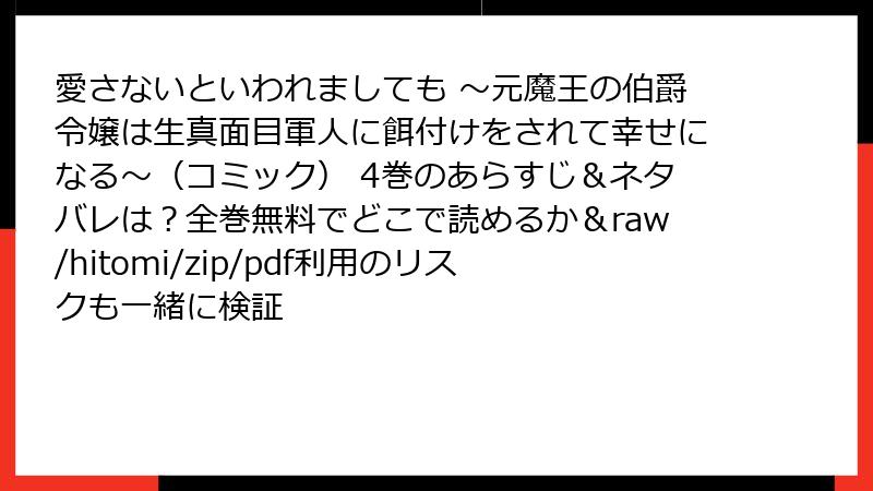 人気のファンタジーロマンス漫画「愛さないといわれましても ~元魔王の伯爵令嬢は生真面目軍人に餌付けをされて幸せになる~」を、raw、hitomi、zip、pdf、漫画バンクなどの海賊版サイトで読むことは、手軽に思えるかもしれません。しかし、これらのサイトを利用する行為には深刻なリスクが伴います。この記事では、法的、セキュリティ、プライバシー、倫理的・経済的、品質面の観点から詳しく解説します。海賊版サイトの使用は避け、正規のプラットフォームで楽しむことをおすすめします。