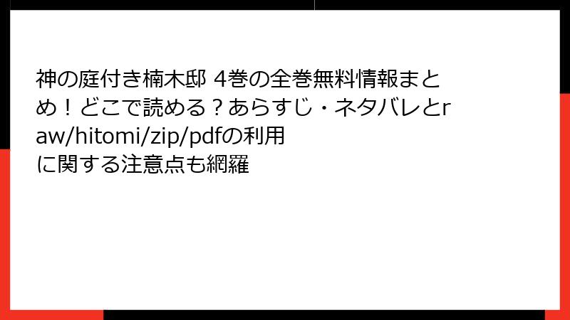 人気コミック「神の庭付き楠木邸」を、raw、hitomi、zip、pdf、漫画バンクなどの海賊版サイトで無料で読もうと考える人もいるかもしれません。しかし、これらのサイトを利用するのは一見便利に見えて、実は多大なリスクを伴います。この記事では、そんな海賊版サイトの危険性を詳しく解説します。法的問題からセキュリティの脅威、品質の低下まで、さまざまな側面から掘り下げ、なぜ避けるべきかを明らかにします。安全に楽しむための代替手段も触れつつ、読者の皆さんが賢い選択をできるようにお伝えします。