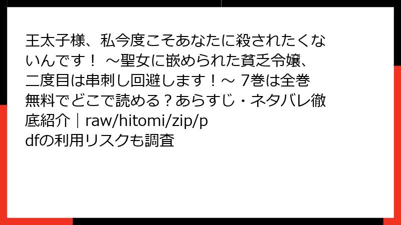 - 王子様、私今度こそあなたに殺されたくないんです! ~聖女に嵌められた貧乏令嬢、二度目は串刺し回避します!~ 7巻をraw/hitomi/zip/pdf/漫画バンクなどの海賊版サイトで読むリスク
