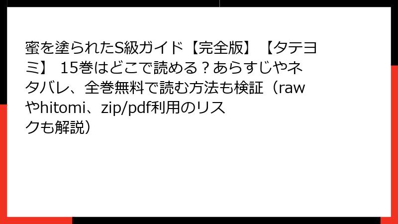 こんにちは、漫画ファンとして、海賊版サイトの利用がもたらす問題について真剣に考えている皆さん。今日は、人気BLウェブトゥーン『蜜を塗られたS級ガイド【完全版】【タテヨミ】』を、raw、hitomi、zip、pdf、漫画バンクなどの海賊版サイトで読むリスクを徹底的に解説します。これらのサイトは一見便利に見えますが、実は深刻な危険が潜んでいます。法的、セキュリティ、プライバシー、経済的、倫理的な観点から詳しく見ていきましょう。未然に防ぐための知識としてお役立てください。