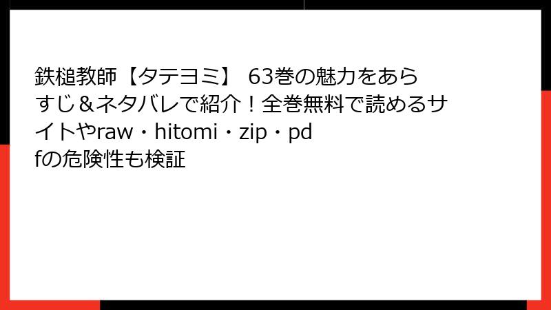 「鉄槌教師【タテヨミ】」のような人気漫画を、raw/hitomi/zip/pdf/漫画バンクなどの海賊版サイトで読むのは一見手軽ですが、さまざまなリスクが伴います。これらのサイトは違法アップロードされたコンテンツを提供しており、利用者は知らず知らずのうちに深刻な問題に巻き込まれる可能性があります。この記事では、海賊版サイト利用のリスクを法的、セキュリティ、プライバシー、品質、倫理的、経済的な観点から詳しく解説します。合法的なプラットフォームを利用することを強くおすすめします。