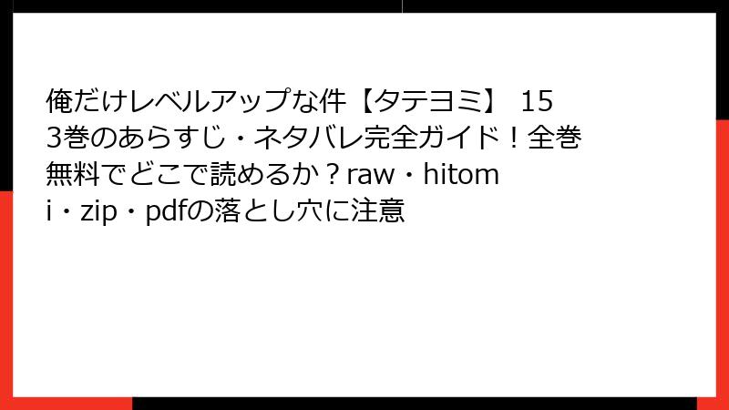 「俺だけレベルアップな件」は、主人公の水篠旬が最弱のE級ハンターからシステムの力で急成長を遂げ、世界最強のハンターへと進化していくファンタジーアクション漫画です。153巻では、前巻で激しい戦いを終えた水篠の元に新たな訪問者が現れ、物語が新たな展開を迎えます。前巻では、水篠が強敵を倒し、影の軍団を強化したところで終了しており、この巻ではその余波と新たな脅威が描かれています。全体として、緊張感が高まり、国際的なハンターたちの関係性が深掘りされます。