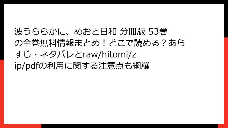 人気漫画「波うららかに、めおと日和」の分冊版53巻を、raw、hitomi、zip、pdf、漫画バンクなどの海賊版サイトで読むのは、一見手軽に思えますが、多大なリスクを伴います。これらのサイトは著作権を侵害した違法コンテンツを提供しており、利用者は法的、セキュリティ、プライバシー、倫理的な問題に直面する可能性が高いです。以下で、各リスクを詳しく解説します。海賊版サイトの利用は、短期的な利便性よりも長期的な損失が大きいことを理解しましょう。