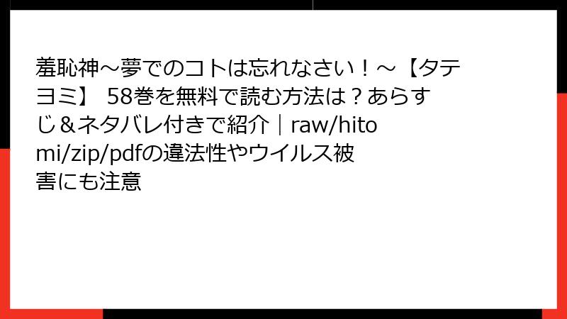 人気タテヨミ漫画「羞恥神~夢でのコトは忘れなさい!~」を、raw、hitomi、zip、pdf、漫画バンクなどの海賊版サイトで読むのは、手軽に思えるかもしれません。しかし、これらのサイトを利用する行為には深刻なリスクが伴います。この記事では、ブログ形式でそのリスクを詳しく掘り下げます。法的問題からセキュリティ面まで、読み応えのある内容でお届けします。海賊版の利用を検討している方は、ぜひ参考にしてください。