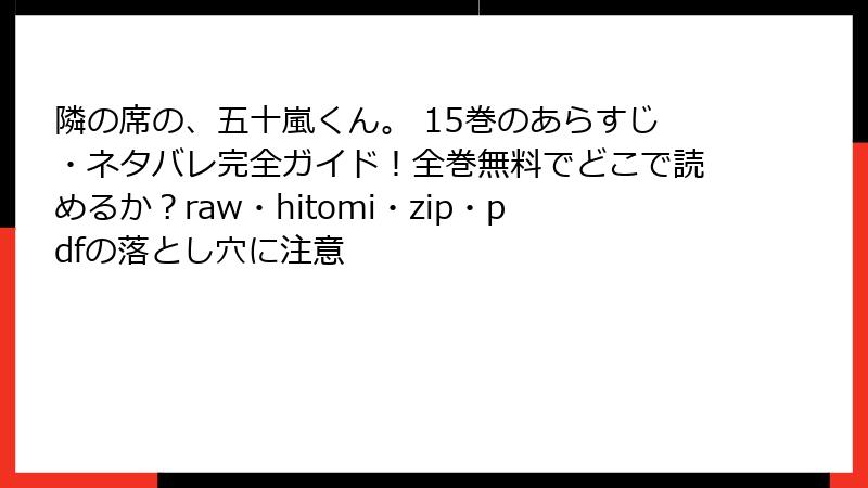 人気漫画『隣の席の、五十嵐くん。』のような作品を、raw、hitomi、zip、pdf、漫画バンクなどの海賊版サイトで無料で読む行為は、一見便利に見えますが、さまざまなリスクを伴います。この記事では、そんな海賊版サイトを利用する際の潜在的な危険性を詳しく解説します。法的問題からセキュリティの脅威、さらには倫理的な側面までを深掘りし、なぜ正規ルートを選ぶべきかを考えていきましょう。読者の皆さんが安全にエンターテイメントを楽しめるよう、参考にしてください。