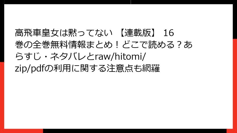 人気漫画「高飛車皇女は黙ってない」の連載版第16巻は、魅力的なストーリーとキャラクターでファンを魅了しています。しかし、海賊版サイト(raw、hitomi、zip、pdf、漫画バンクなど)を利用して無料で読む行為は、さまざまなリスクを伴います。この記事では、そうした海賊版サイトの利用がもたらす法的、セキュリティ、品質、倫理的、経済的な問題を詳しく解説します。合法的な手段で楽しむことをおすすめしますが、ここではリスクを深掘りして、なぜ避けるべきかを読み応えのある形でまとめます。