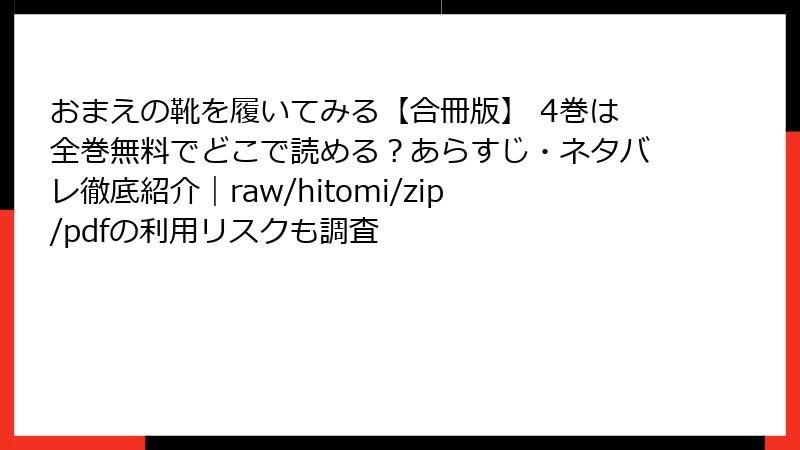 人気BL漫画『おまえの靴を履いてみる【合冊版】4巻』をraw、hitomi、zip、pdf形式、漫画バンクなどの海賊版サイトで無料で読もうとするのは非常に危険です。これらのサイトは著作権を侵害した違法コンテンツを配信しており、利用者自身が法的・セキュリティ上の大きなリスクを負うことになります。以下で法的リスク、ウイルス感染、個人情報漏洩、クリエイターへの影響など、多角的に詳しく解説します。読む前に必ず知っておくべき内容です。