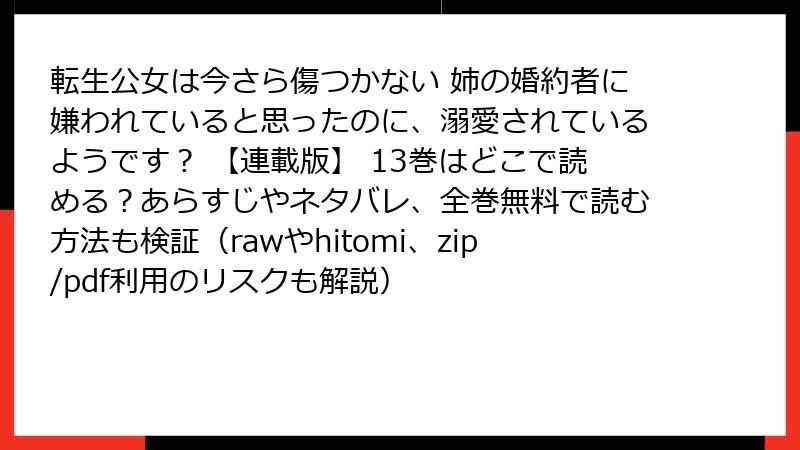 人気の転生ラブファンタジー漫画「転生公女は今さら傷つかない 姉の婚約者に嫌われていると思ったのに、溺愛されているようです? 【連載版】」を楽しむために、海賊版サイトを利用する人もいるかもしれません。しかし、これらのサイト(raw、hitomi、zip、pdf、漫画バンクなど)で読むことは、無料の魅力に隠れた深刻なリスクを伴います。法的問題からセキュリティの脅威、倫理的な側面まで、以下で詳しく解説します。公式ルートを選ぶことで、クリエイターを支援し、安全に楽しむのがおすすめです。