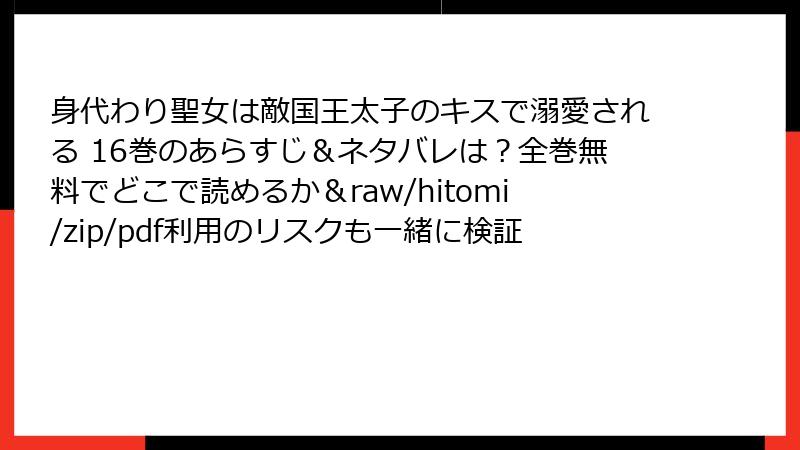 人気のファンタジーロマンス漫画「身代わり聖女は敵国王太子のキスで溺愛される」を、海賊版サイトで無料で読もうとする人は少なくありません。しかし、これらのサイトを利用することは、さまざまな深刻なリスクを伴います。この記事では、法的問題からセキュリティの脅威までを詳しく解説し、なぜ公式ルートを選ぶべきかを考えます。海賊版は一時的な便利さを提供するかもしれませんが、長期的な損失が大きいのです。